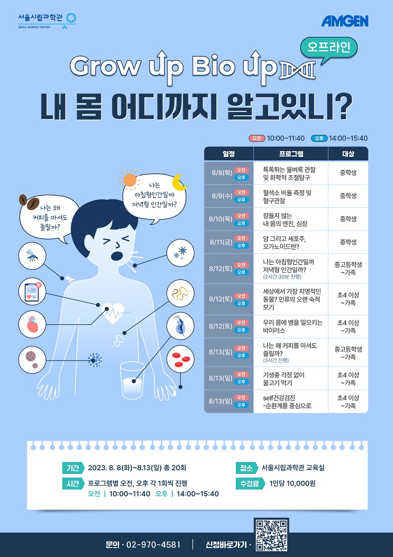 (2023년 7월 10일) 암젠코리아(대표 노상경)와 서울시립과학관(관장 유만선)은 국내 아동·청소년의 생명과학 교육 지원 및 육성을 위한 ‘그로우 업, 바이오 업(Grow up, Bio up) 생명과학 교육 캠페인(이하 그로우 업, 바이오 업)’을 온·오프라인으로 개최한다고 10일 밝혔다.