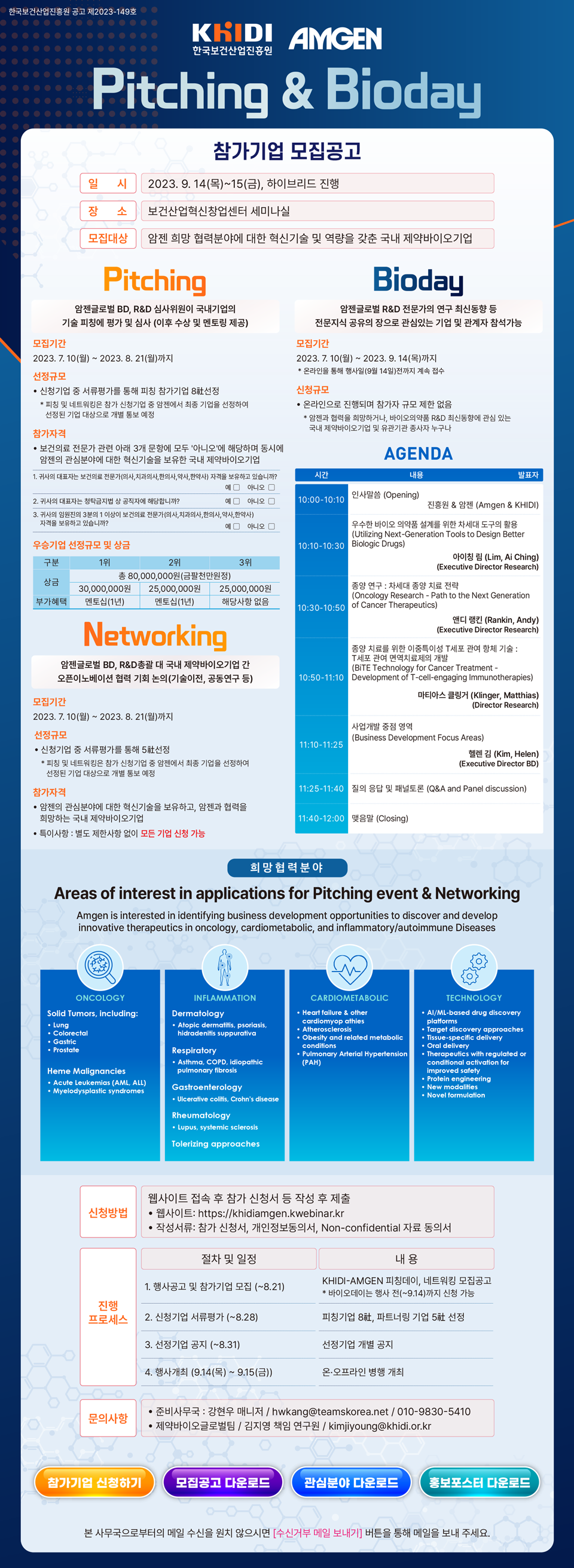(2023년 8월 17일) 암젠코리아(대표 노상경, 이하 암젠)와 한국보건산업진흥원(원장 차순도, 이하 진흥원)은 글로벌 R&D 최신 동향과 연구 성과를 공유하고, 상호 간의 협력을 도모하는 ‘2023 진흥원-암젠 사이언스 아카데미: 바이오데이(이하 바이오데이)’를 오는 9월 15일 온라인에서 공동 개최한다.