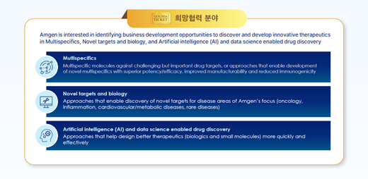 ‘암젠 골든티켓(Golden Ticket)’은 생명공학 스타트업의 개발 초기 단계부터 혁신적인 기업으로 성장을 지원하기 위한 글로벌 프로그램이다. 올해 프로그램은 ▲다중특이성 의약품 개발(Multispecifics), ▲종양, 염증, 심혈관 대사, 희귀질환에서의 새로운 접근 방법(Novel targets and biology), ▲AI 등 데이터 사이언스 기반 신약 후보 물질 발굴(AI and data science enable drug discovery) 등 총 3가지 암젠의 관심 분야 기술을 연구 중인 기업을 대상으로 한다.