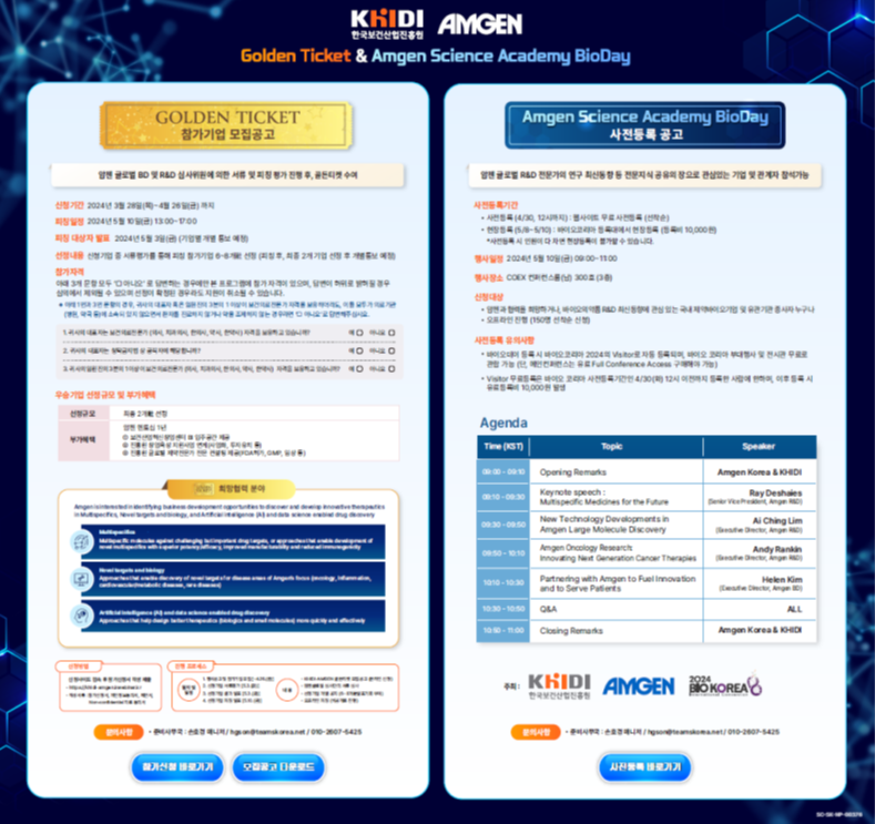 (2024년 3월 28일) 암젠코리아(대표 노상경, 이하 암젠)와 한국보건산업진흥원(원장 차순도, 이하 진흥원)은 오픈 이노베이션 프로그램인 ‘2024 진흥원-암젠 골든티켓(Golden Ticket)’의 온라인 참가 신청 접수를 시작한다. 참여 신청은 3월 28일(목)부터 4월 26일(금)까지로, 공식 웹사이트를 통해 진행된다.