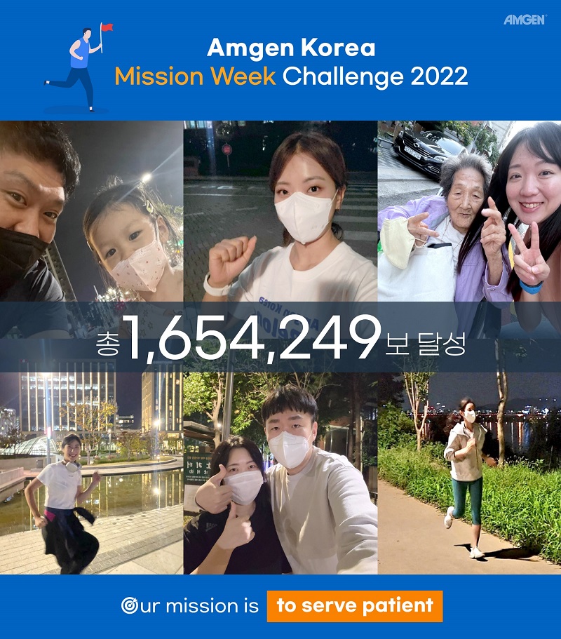 (2022년 10월 12일) 바이오테크놀로지 리딩 기업인 암젠코리아(대표 노상경)는 암젠의 미션인 ‘환자를 위한다(To Serve Patient)’를 되새기면서 임직원이 한마음으로 기부에 참여하는 ‘암젠코리아 미션위크 챌린지(Amgen Mission Week Challenge)’를 9월 26일(월)부터 30일(금)까지 진행했다고 밝혔다.